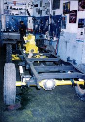 Şaseyi el arabası ile benzinciye götürü, güzelce bir yıkattık, telli fırça ile temizledik. Daha sonra da garaja getirip bakımına başladık. Bu işleri esas yapan Ankara’lı Erkan Metiner Usta (o zamanlar dükkan Büyük Sanayi’deydi, şu anda ise Şaşmaz’dalar. Tel: 532-6647949). Ben de yanında o zamanlar kalfalık yapıyordum, kalfalık deyince gülmeyin, çünkü gerçekten üniversitede her yaz gidip tam mesai çalışırdım orada tamir işlerinde. Yukarıda şasenin yanında poz veren amca is Türkiye’nin ilk yetişen Amerikan otosu tamircilerinden Fikret Amca. Artık çalışmasa da oğlunun dükkanında destek olur ve zaman geçirir.